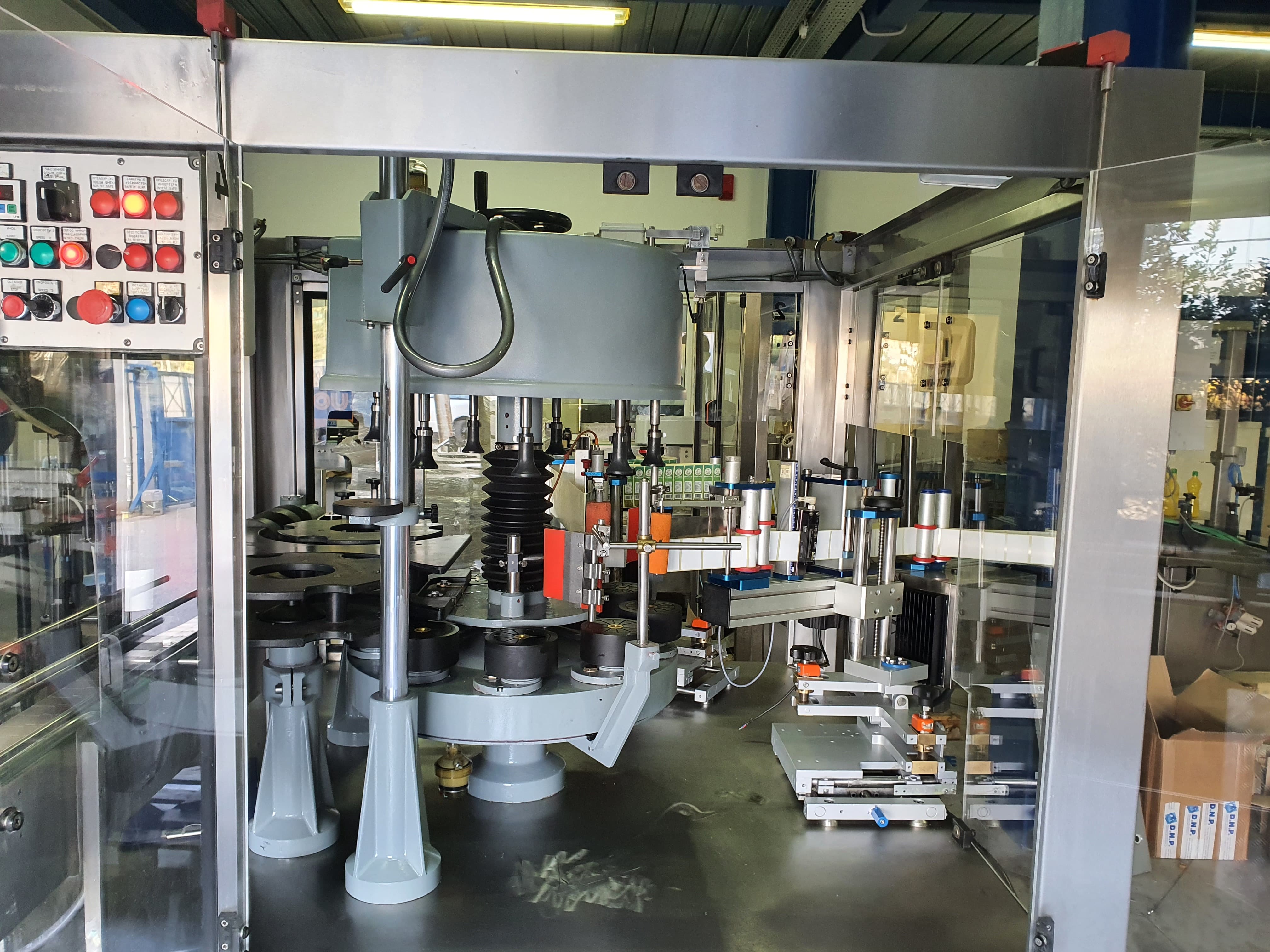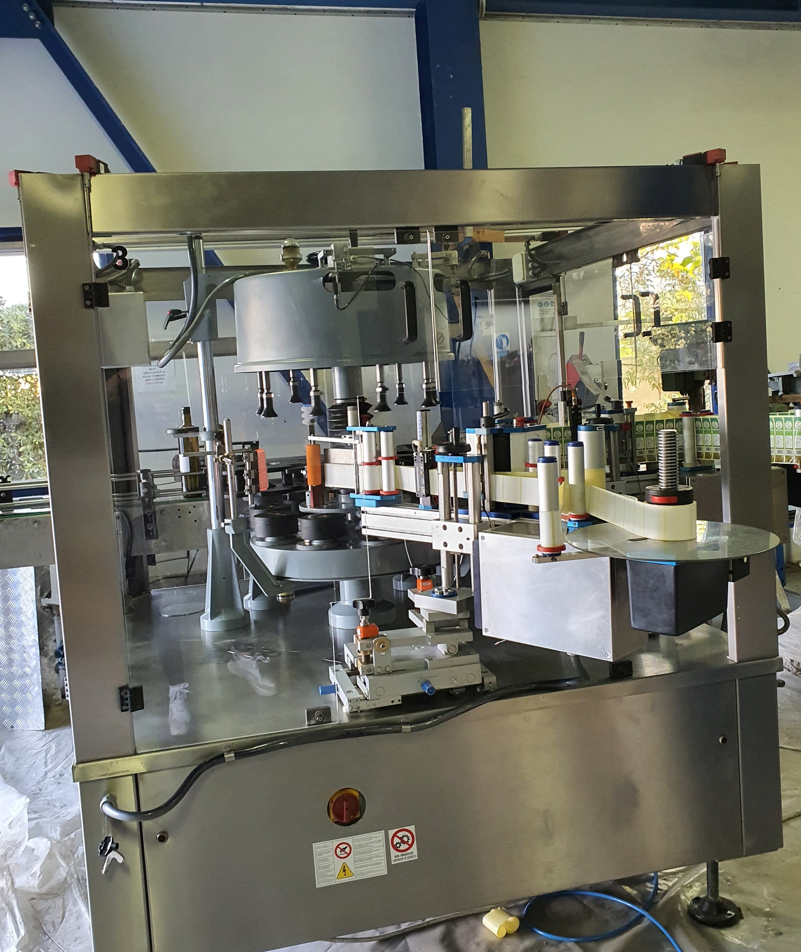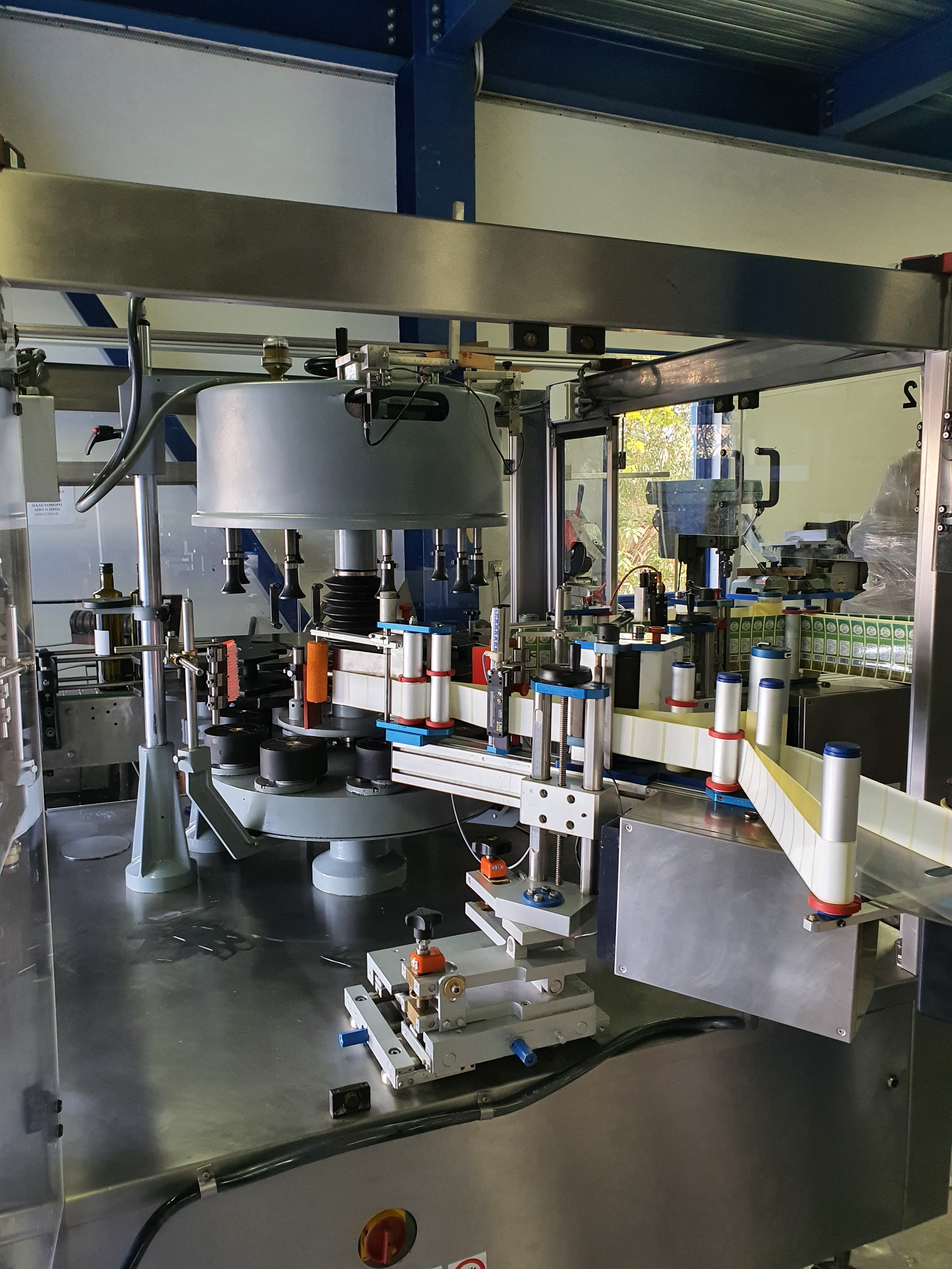 Περιστροφική Ετικετέζα 2 σταθμών κατάλληλη για την επικόλληση ετικέτας και κόντρας ετικέτας σε κυλινρικες ή τετράγωνες φιάλες , με απόδοση 4000-5000 φιάλες / ωρα.